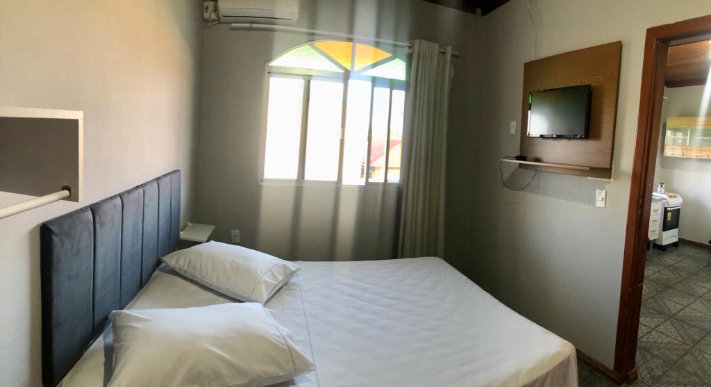 01 Quarto, 01 Banheiro, 01 Cama de Casal, 01 Cama de Solteiro, Geladeira, Micro-ondas, Ar-Condicionado e TV.